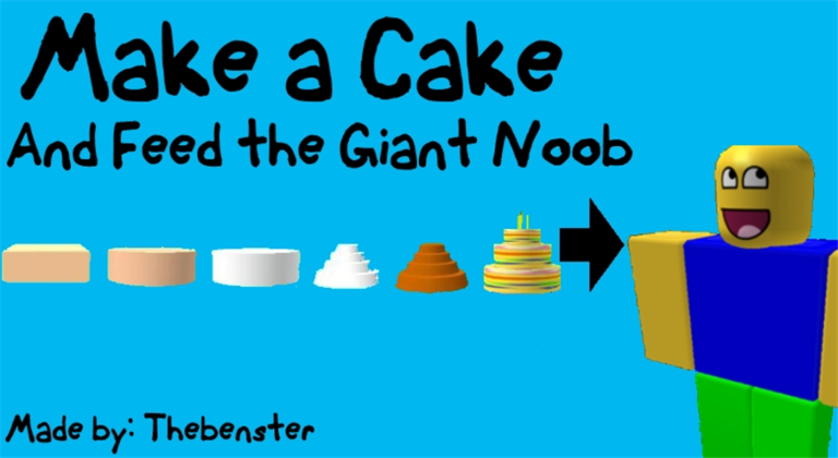 Witamy w Make a Cake i Feed the Giant Noob! Dzięki wielu wyborom ciasta istnieje w sumie 307 kombinacji ciastek! Istnieje 6 stacji w produkcji ciasta, a następnie karmisz go Giant Noob. Istnieje 17 smaków do ciastek, w tym: truskawka, czekolada, wiśnia, hotdog, N00B, bacon, jagoda i wanilia. Istnieje również wiele opcji dodatków i temperatury piekarnika. Co sekundę jesteś w grze, zarabiasz 1 $, aby użyć w sklepie, w którym jest ponad 25 przedmiotów do zakupu! Ukończ mini obby, aby uzyskać dodatkowe pieniądze w grze!